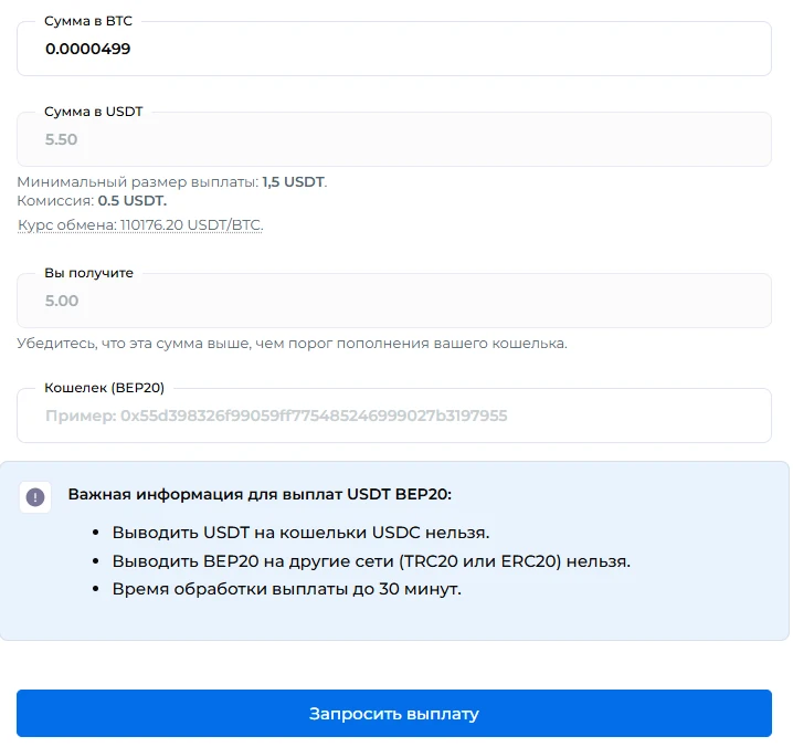 • В разделе “Сумма в BTC” введите количество Биткоинов, чтобы в разделе “Вы получите” была сумма, равная сумме пополнения на Bitrefill. В нашем случае это 5 USDT.