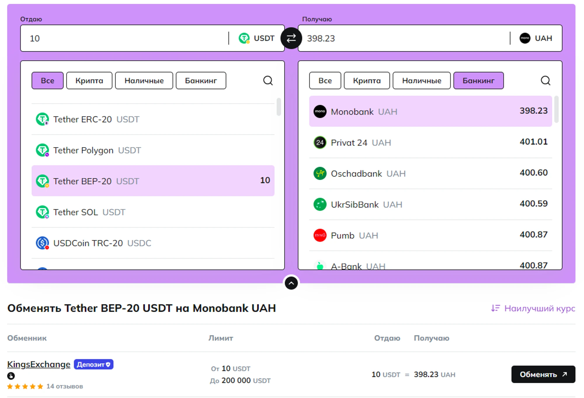 1. Слева в столбце "Отдаю" выберите "Tether BEP-20(USDT)", а справа в графе "Получаю" — гривни в удобной платёжной системе. Для примера, обменяем 10 USDT на гривни на карту Монобанка. По курсу на момент написания, это примерно 400 грн.