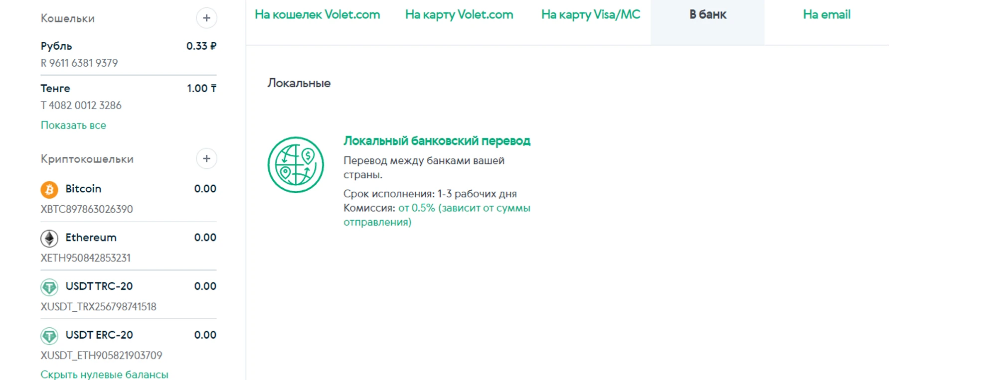 Чтобы отправлять деньги на банковские карты через Volet.com, вам нужно будет пройти верификацию. Верификация простая и занимает 1-2 часа.