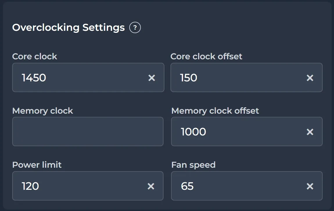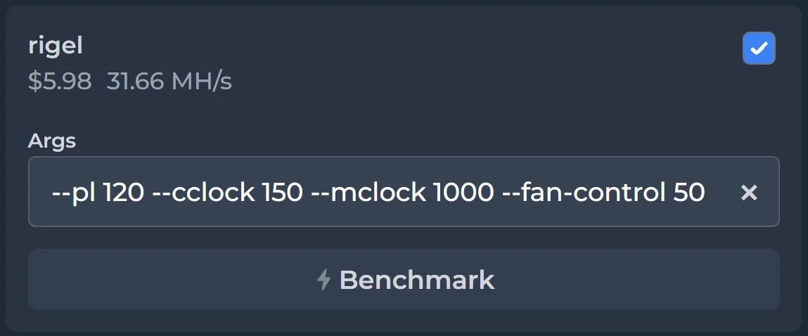 - Skip miner arguments — overclocking works across all miners for the selected GPU and coin.