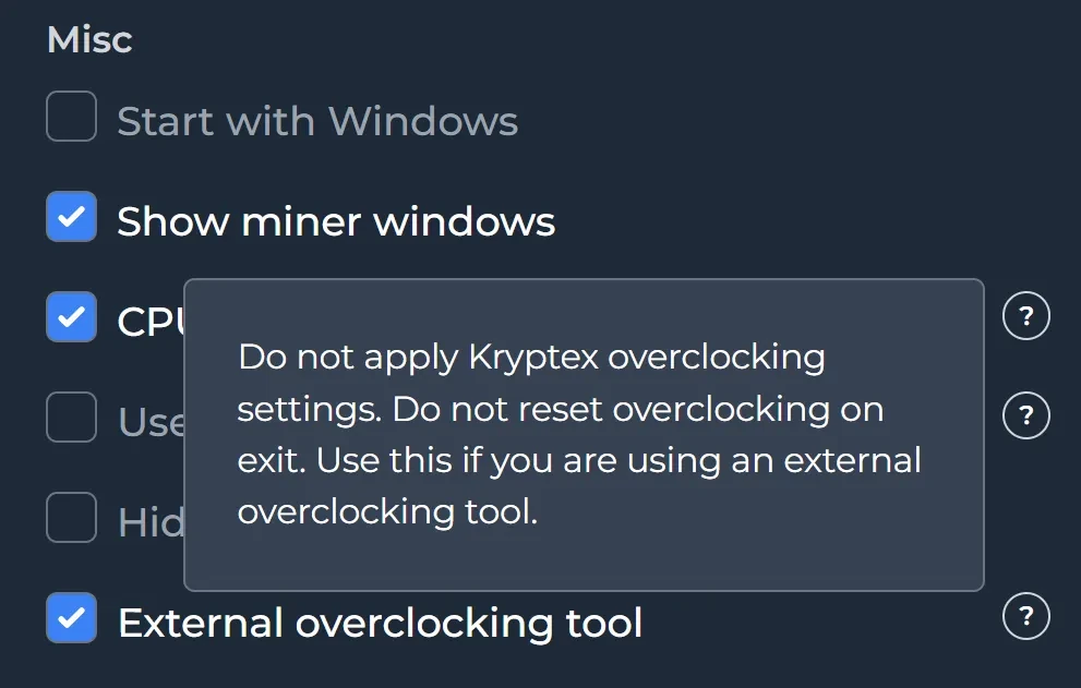 You can still use MSI Afterburner for overclocking — just disable Kryptex’s in-app overclocking.
