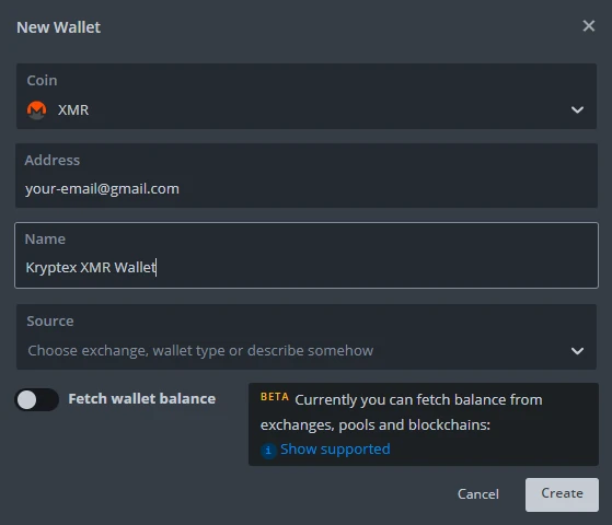 2. Enter the wallet address as follows your-email@gmail.com — your email, registered in Kryptex.
