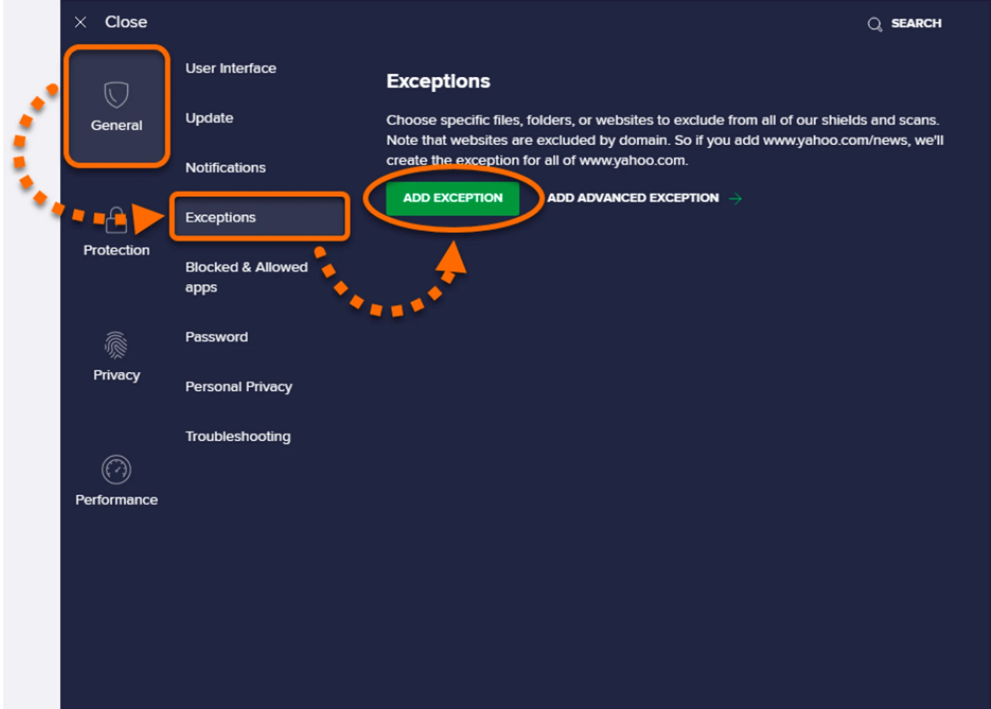 Select “General” —> “Exceptions”, then click “Add Exception”.