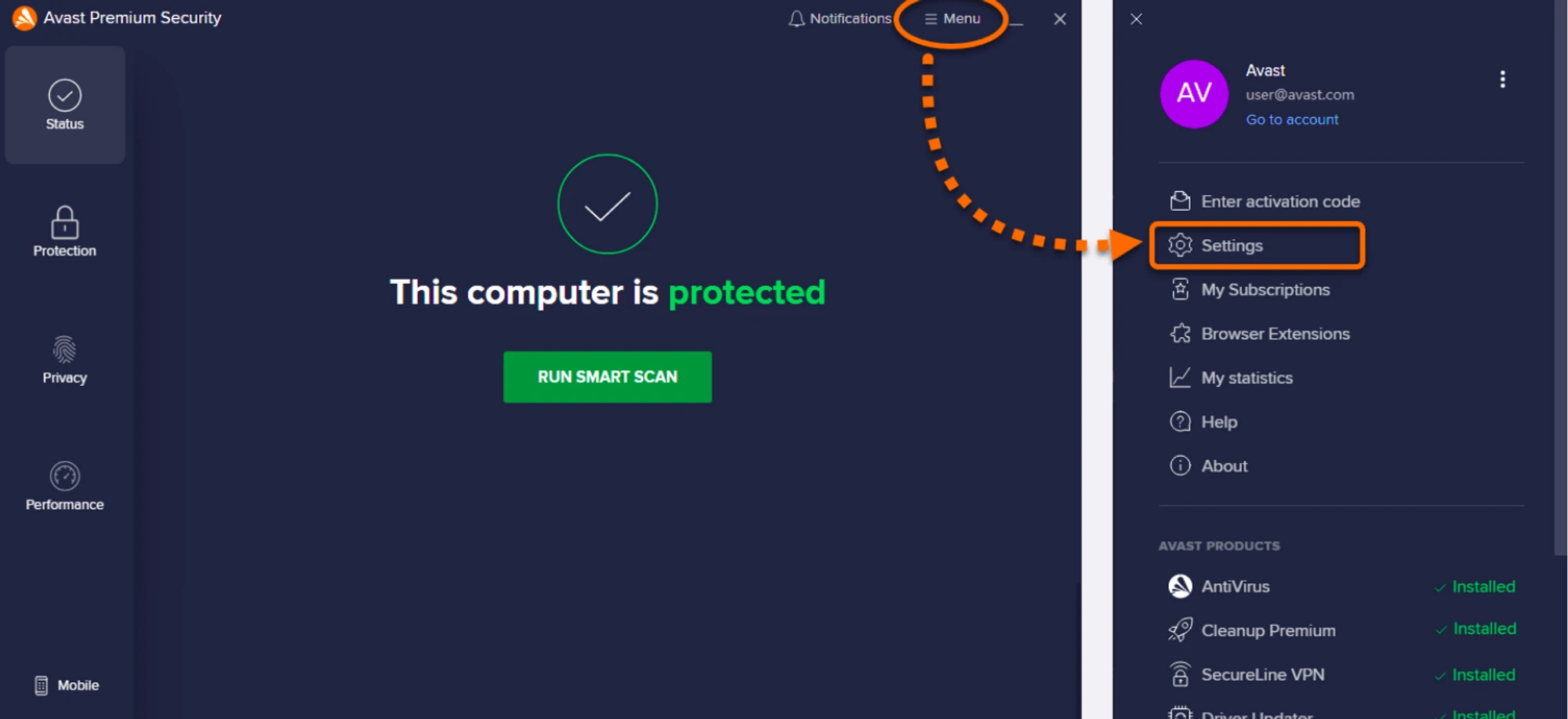☰”Menu” —> “Settings”.