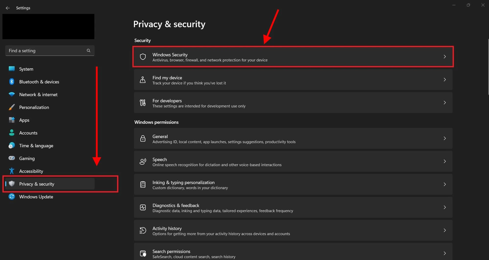 Open the “Windows settings” and go to the “Privacy & Security section”. Choose “Windows Security”.
