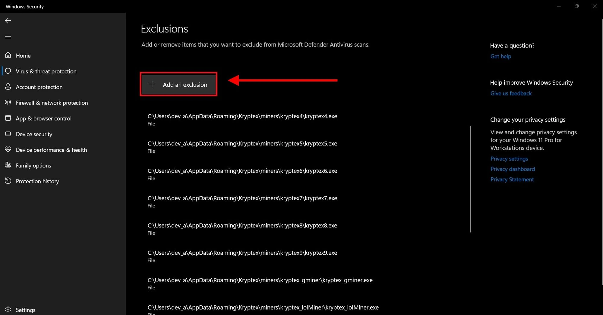 Add Kryptex to Windows 11 Defender exclusion