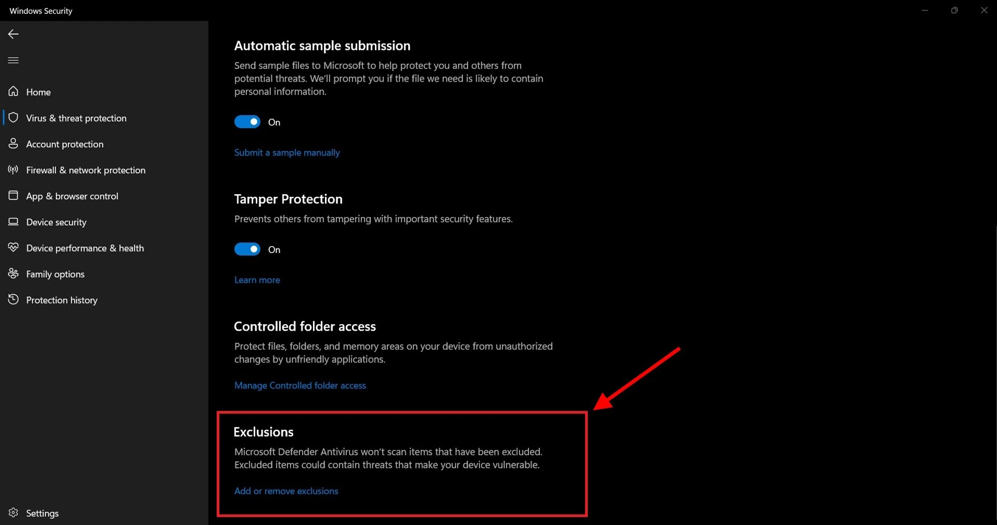 At the bottom of the next page, find the “Exclusions” settings. Click “Add or remove exclusions”.