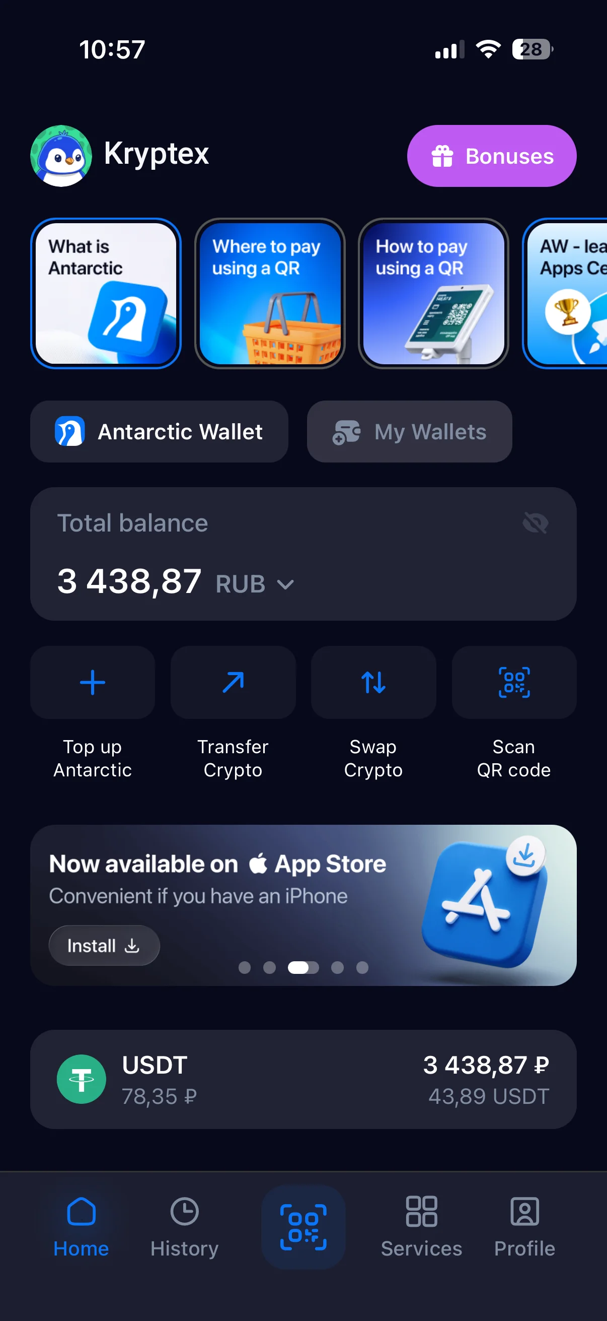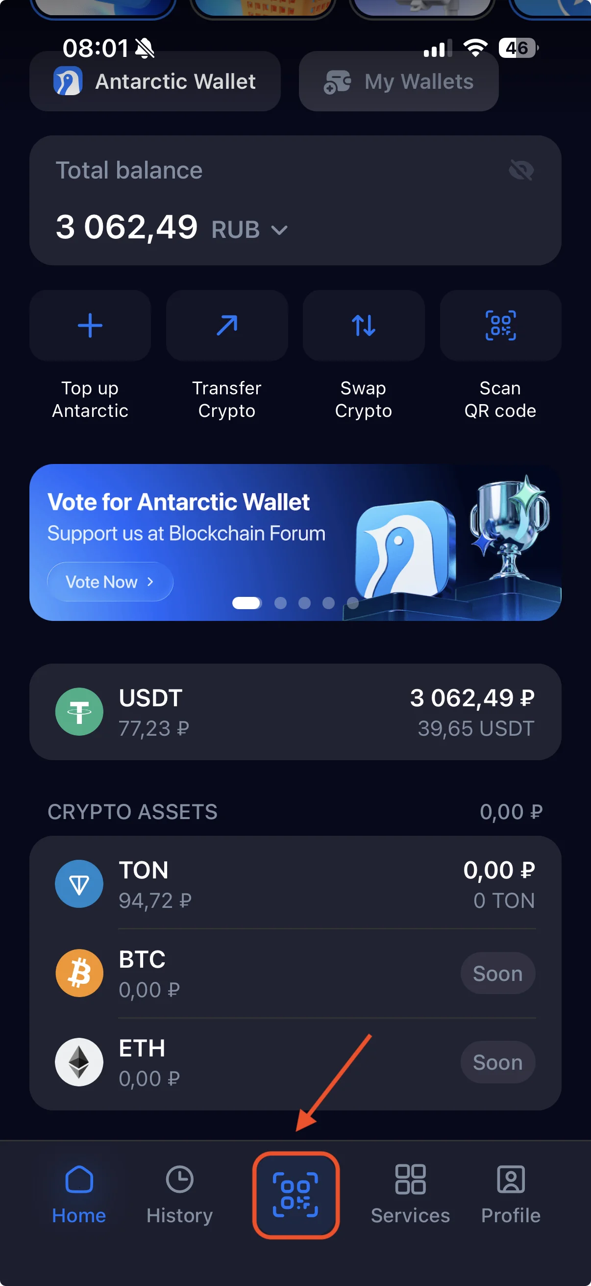 Antarctic Wallet решает эту задачу: это криптокошелёк, который позволяет пополнить баланс в USDT или TON, а потом расплатиться на любой кассе с поддержкой СБП — просто сканируете QR-код, как обычной картой. Без банка, без конвертации заранее, без лишних шагов.