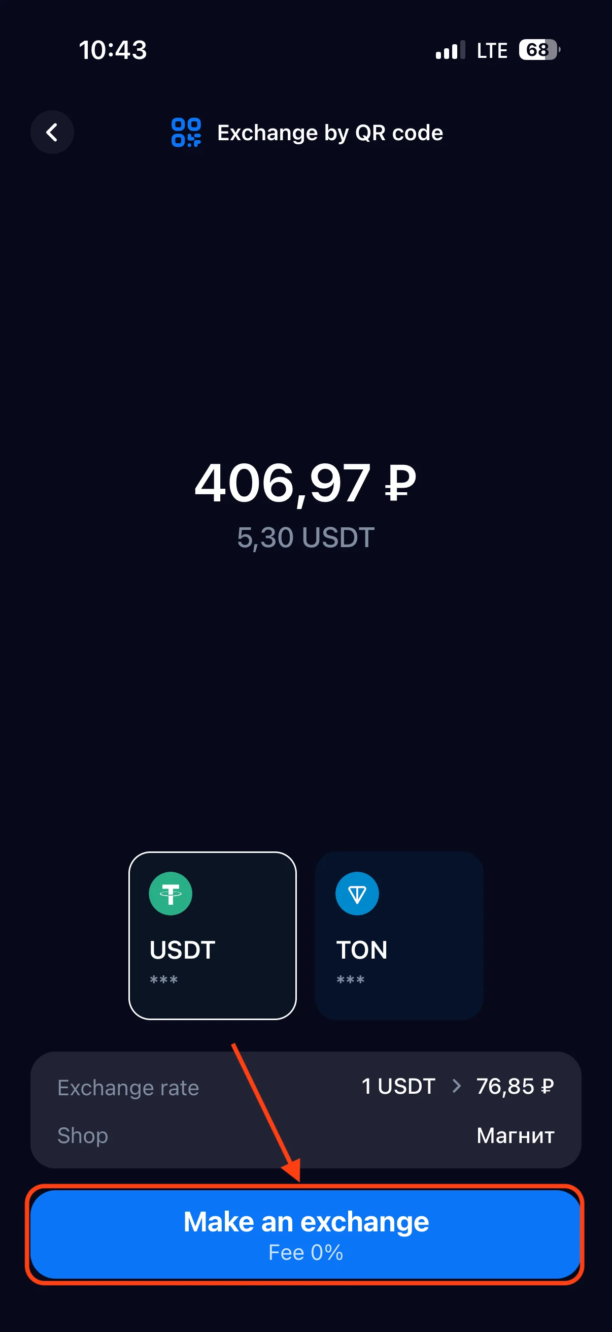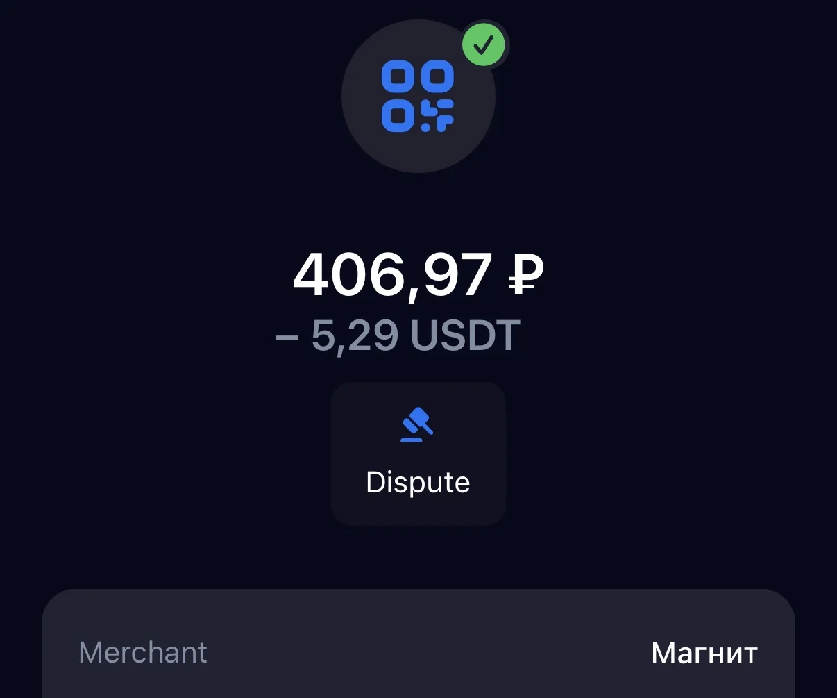Оплата по QR-коду возможна на любом терминале с поддержкой СБП — это большинство крупных магазинов, кафе и АЗС (ищите логотип СБП на кассе). Для оплаты попросите кассира провести платёж через СБП, после чего на экране появится QR-код для сканирования. При оплате кошелёк автоматически сконвертирует USDT в рубли по текущему курсу и переведёт сумму продавцу.