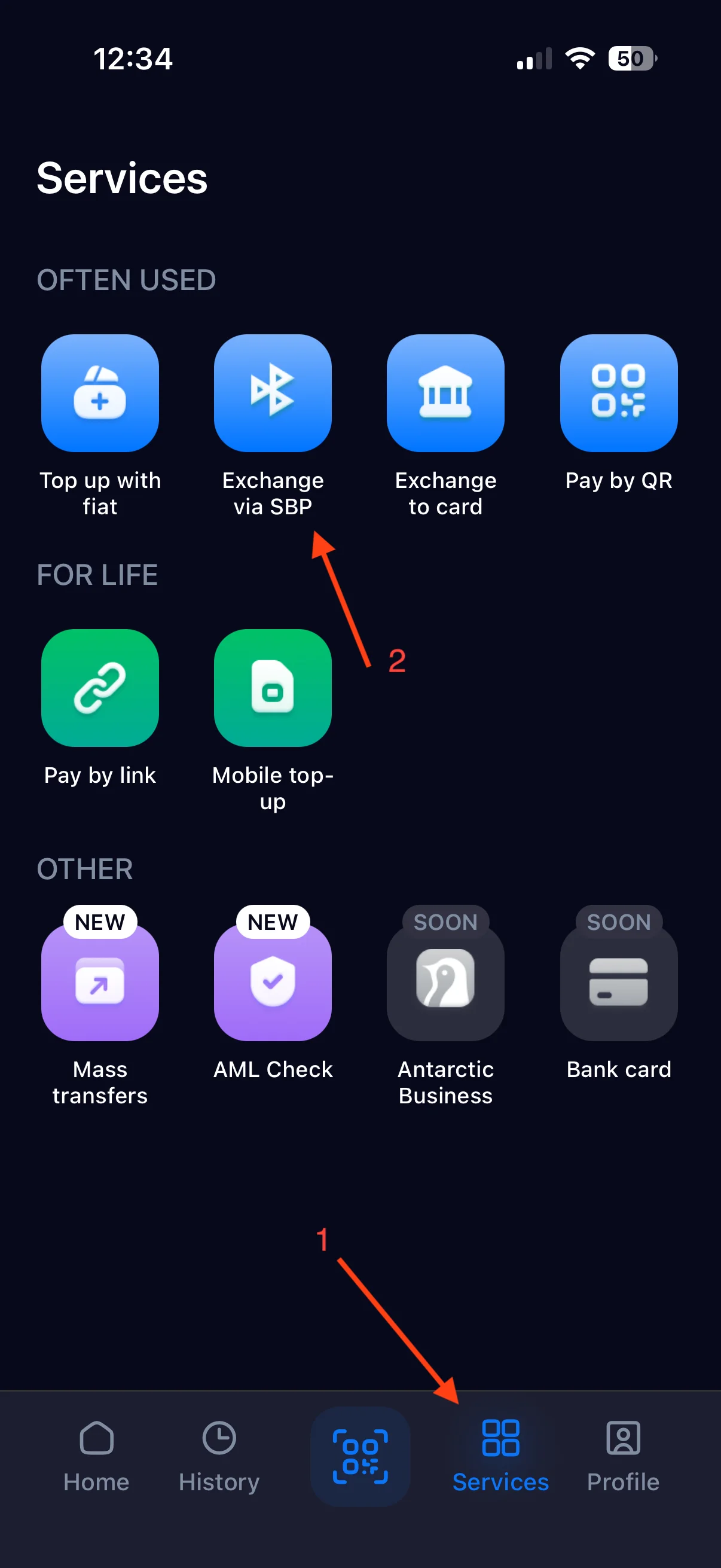 1. Перейдите на вкладку "Сервисы" и выберите "Обменять через СБП".