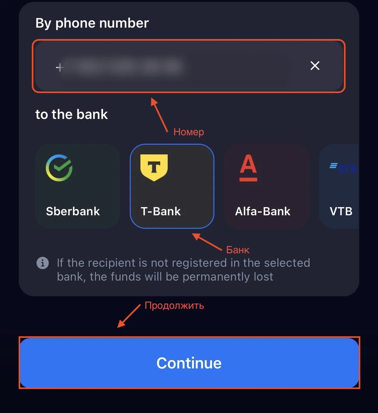 Если получатель не зарегистрирован в выбранном банке, средства могут быть безвозвратно утеряны.