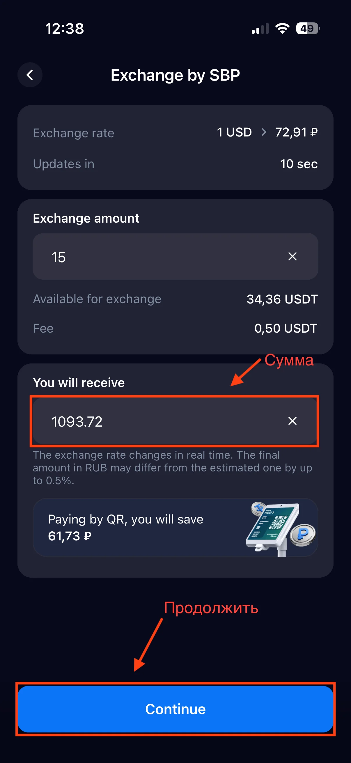 2. Сканируйте QR СБП для оплаты. Затем нажмите "Выполнить обмен".