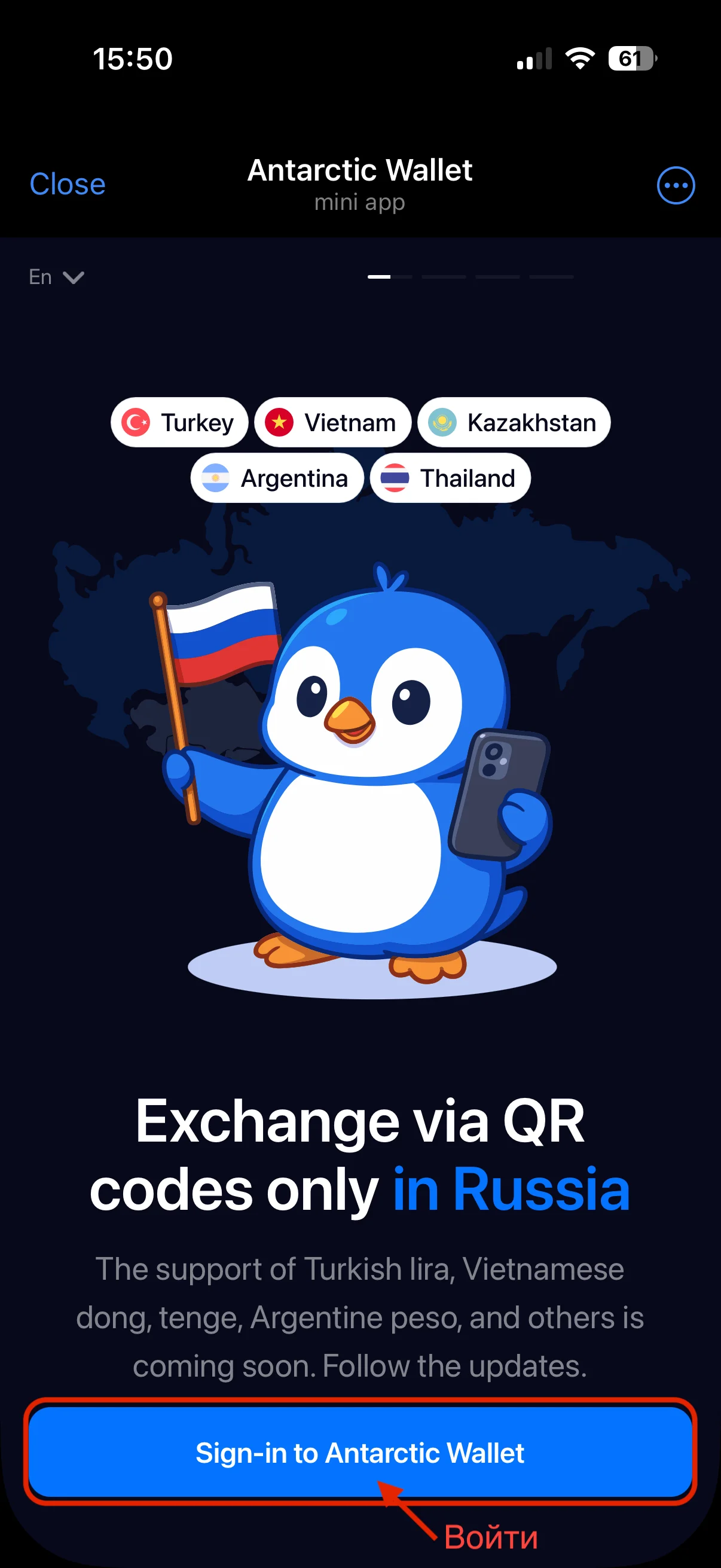 1. Откройте Antarctic Wallet и нажмите "Войти".