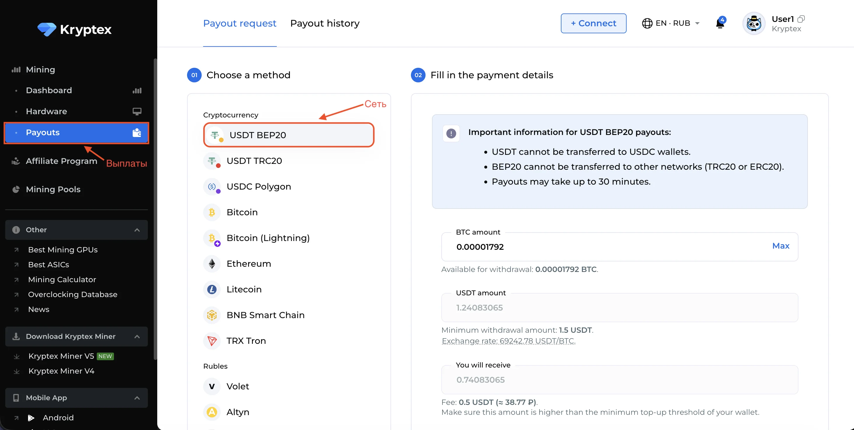 5. Откройте раздел выплат на Kryptex и выберите ту же сеть, что указали в Antarctic Wallet.