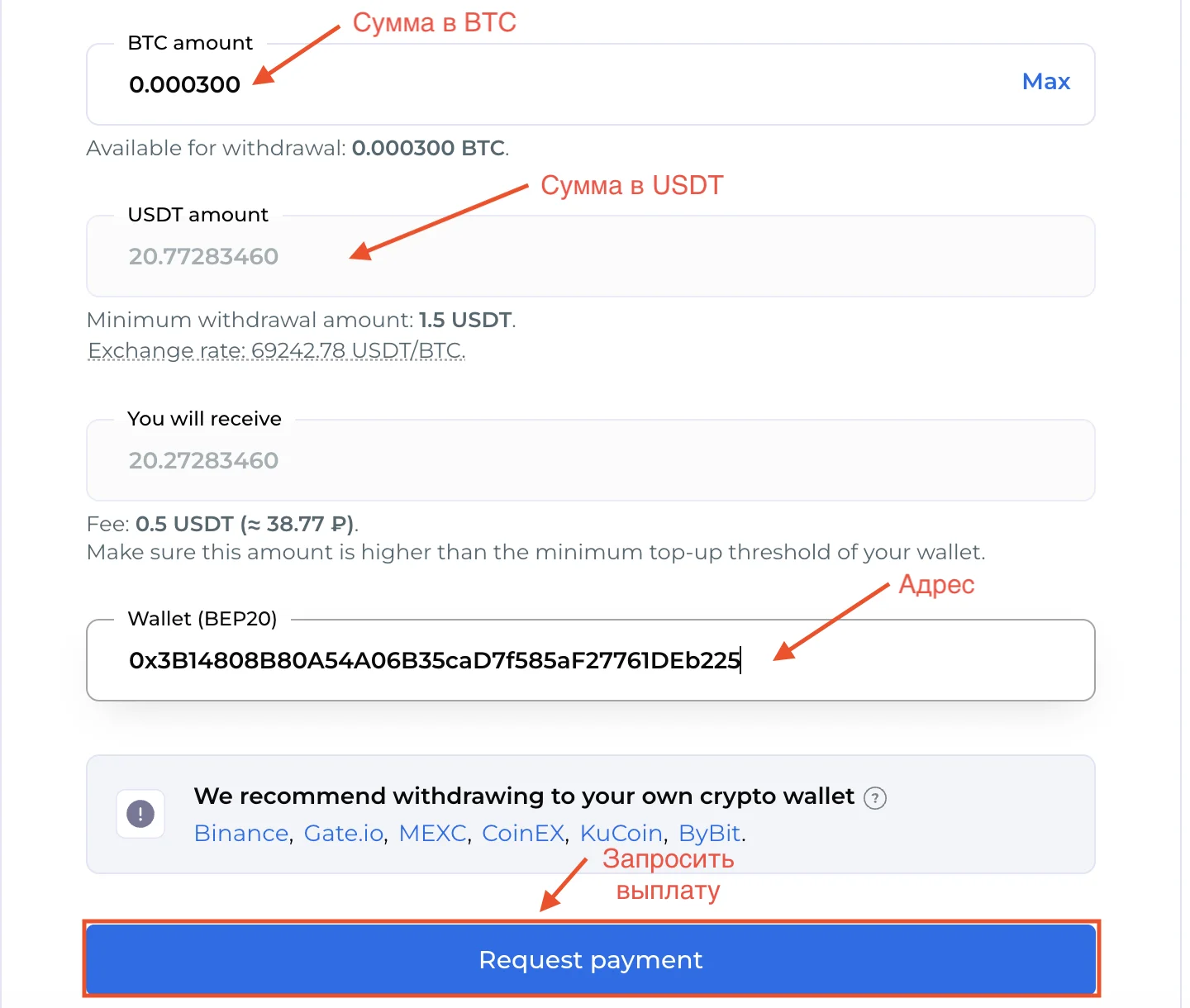 6. Введите сумму выплаты в BTC и вставьте полученный адрес кошелька. Страница автоматически пересчитает сумму по текущему курсу и покажет эквивалент в USDT. После нажмите "Запросить выплату" и подтвердите её по ссылке на почте.