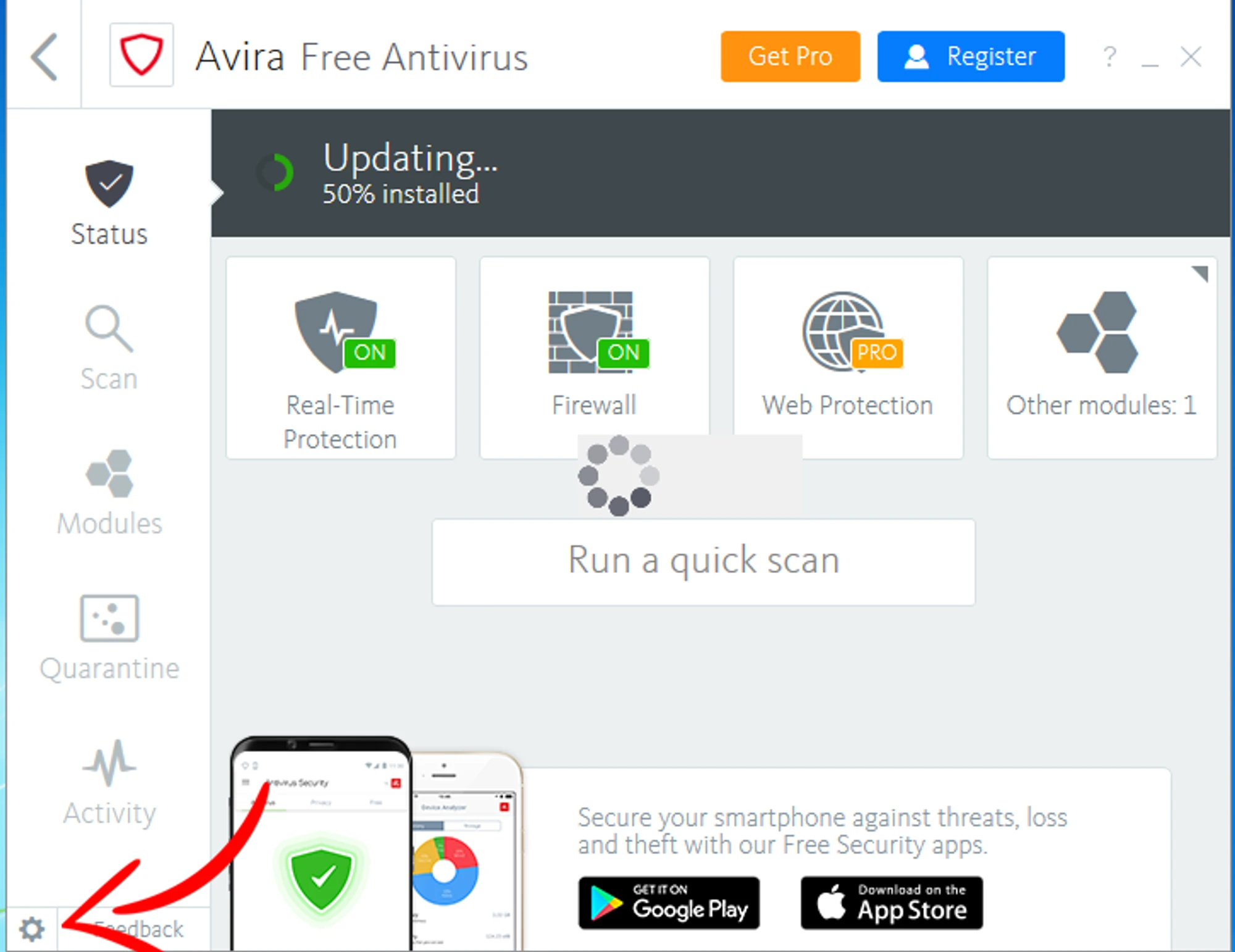 Click on the “Gear” in the lower left corner of your antivirus. The configuration menu will open.
