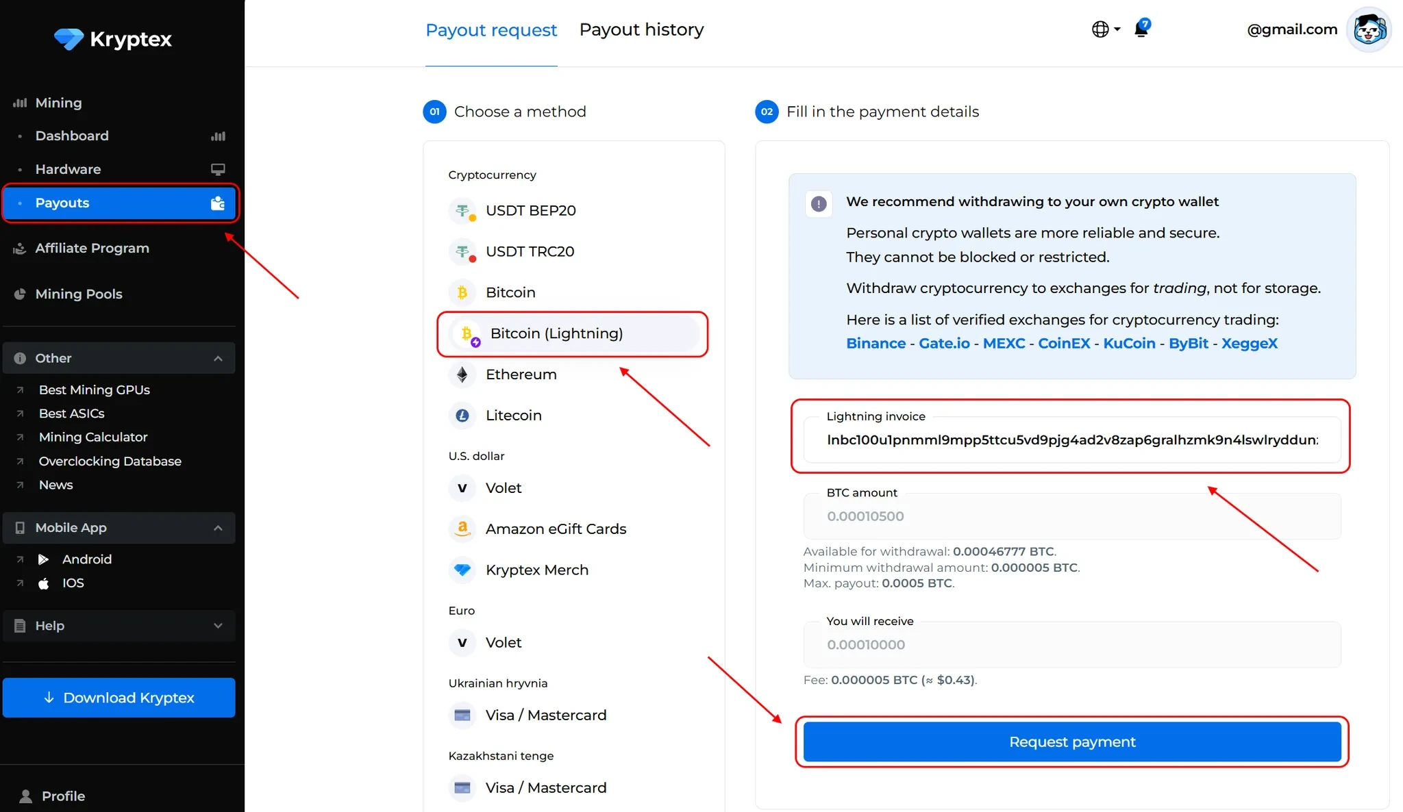 5. Open the payout page Bitcoin (Lightning) in the Kryptex personal account.