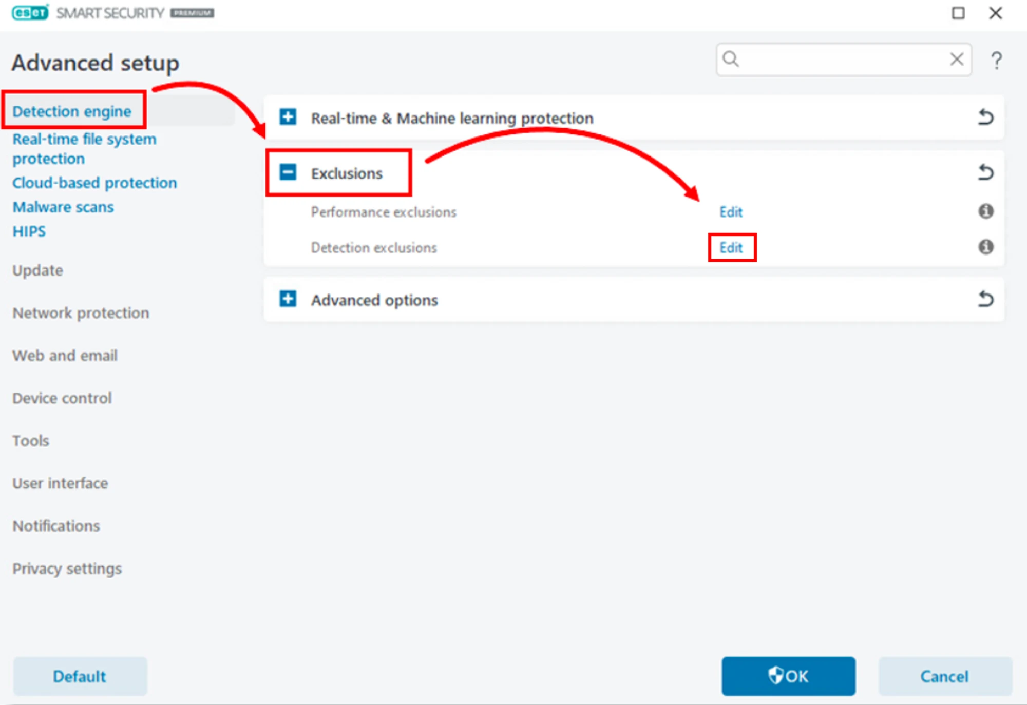 Click “Detection Engine”, expand “Exclusions” and click “Edit” next to “Detection Exclusions”.