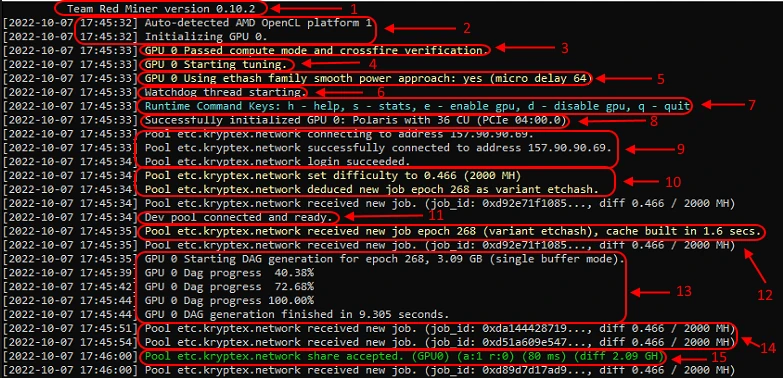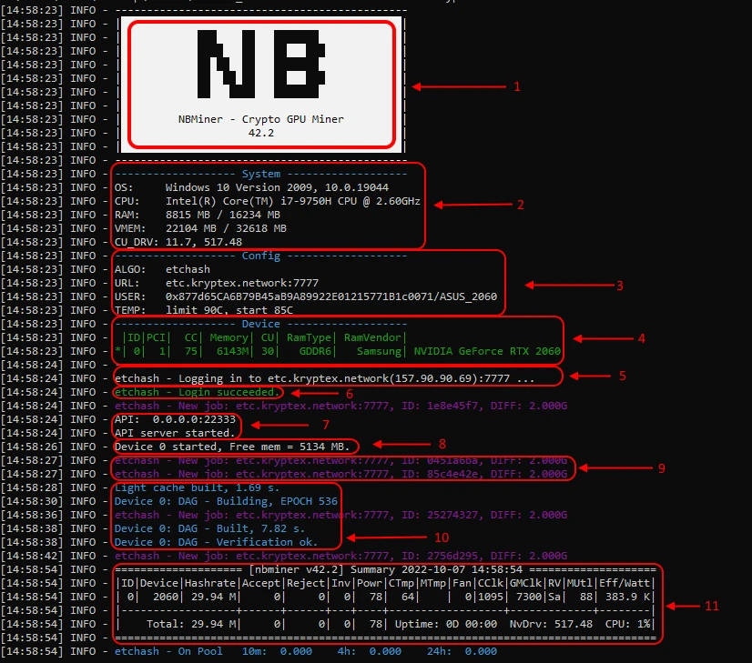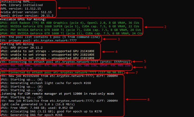 8. The process of launching the mining. The ID of the received work, pool address, and complexity of the shares on the pool (set by the pool). The process of DAG file generation, the amount of free memory of the graphics card, the time for which the DAG file is generated, and the epoch of the DAG file.
