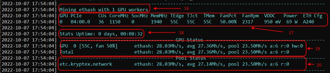 17. Mining summary: Uptime — the time of the current session of uninterrupted mining from its start. What algorithm is being mined, the driver version and the miner version.