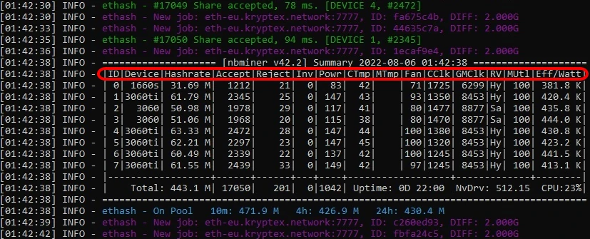 6. A summary of the state of the graphics cards. Their temperature, power consumption, fan speeds, total consumption, and mining efficiency.
