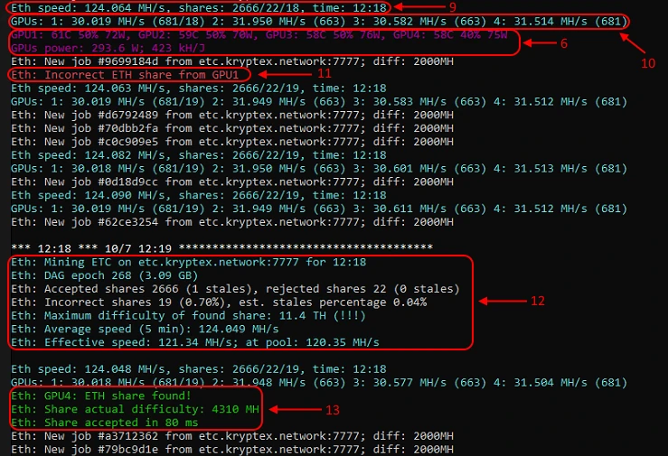 11. Redline — always means wrong behavior or error. Pay attention to it. The miner reports that the GPU1 graphics card (from point 2 — AMD RX 480 8Gb) sent another invalid share. There is a problem with this graphics card.